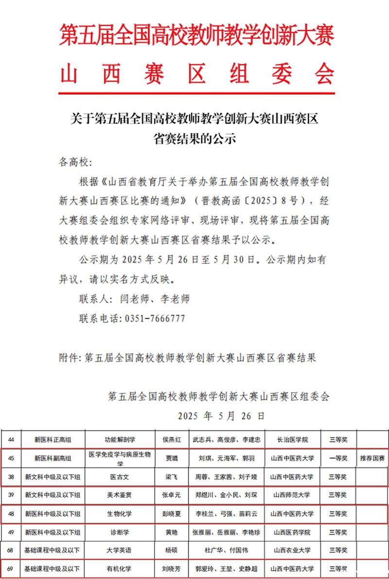 近日,由教育部高等教育司指导,山西省教育厅举办的第五届教师教学创新大赛山西赛区结果揭晓,基础医学院以贾璐为代表的《医学免疫学与病原生物学》课程团队在此次省赛中斩获新医科组副高组一等奖,并被推荐参加国赛,刷新了我校在教创赛中的历史最佳成绩。以刘晓芳为代表的《有机化学》课程团队、彭晓夏为代表的《生物化学》课程团队、梁飞为代表的《医古文》课程团队分别获得新医科组、新文科组中级及以下组三等奖。